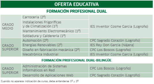 Educación planifica cada año la oferta académica de Formación Profesional Dual en colaboración con las empresas riojanas para adaptarse al perfil laboral que ellas demandan. Esto significa que se ofertan nuevos ciclos cada curso al tiempo que otros desaparecen, ya que el Gobierno de La Rioja busca con esta modalidad educativa cubrir las necesidades de personal de las empresas sin saturar el mercado laboral.