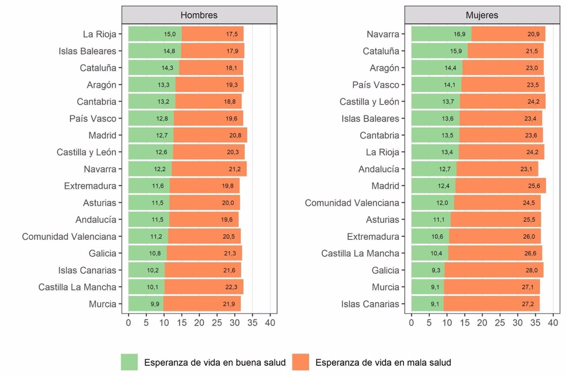 Las comunidades autónomas que tienen una esperanza de vida en buena salud más alta son La Rioja, Islas Baleares y Cataluña en hombres y Navarra, Cataluña y Aragón en mujeres, mientras que por la cola se encuentran Murcia, Castilla-La Mancha e Islas Canarias en hombres e Islas Canarias, Murcia y Galicia en mujeres.