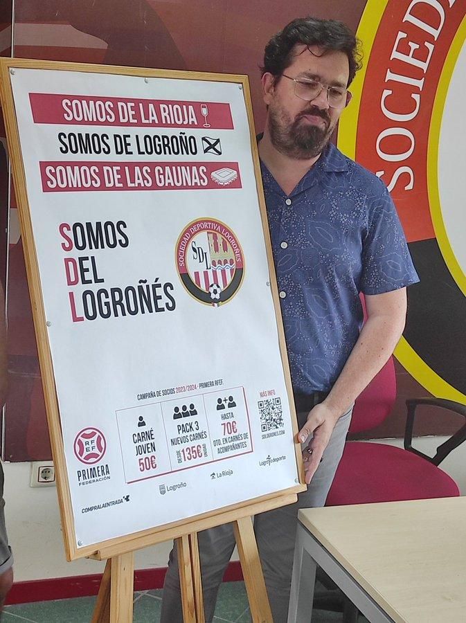 La SD Logroñés ha presentado este lunes en Las Gaunas su campaña de socios para la temporada 2023-24. Bajo el lema 'Somos Del Logroñés', el club de la capital de La Rioja mantiene los precios de los carnets de la pasada temporada y, además, presenta ofertas especiales y otras novedades. El presidente del club, Eduardo Guerra, y el corresponsable de prensa, José Luis Ouro, han presentado una campaña que, como ha destacado el propio Ouro, a pesar de la “exigencia económica de la categoría”, no ve sus precios aumentados en consonancia. El club no tiene un número de socios fijado como objetivo. “Tiene que ir acorde a lo que ofrece el club. Nos gustaría crecer”, ha admitido Ouro.