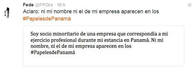 Precisamente, Federico Pérez Oteiza publicaba este viernes a última hora en su cuenta de Twitter que ni él ni su empresa aparecen en los 'papeles de Panamá' e incidía una vez más en que es socio minotario de una empresa, en alusión a Valdezcaray Corp.Empresa de la que, al margen de su participación accionarial, tenía plenos poderes otorgados. Ninguna explicación de momento sobre esta segunda compañía.