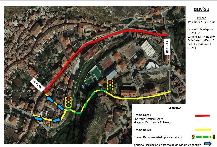 La carretera regional LR-284 en Cervera del Río Alhama permanecerá cortada al tráfico durante los días laborables a partir del lunes día 26 de septiembre en el tramo comprendido entre los puntos kilométricos 0 y 1,010. La circulación quedará abierta fines de semana y festivos.