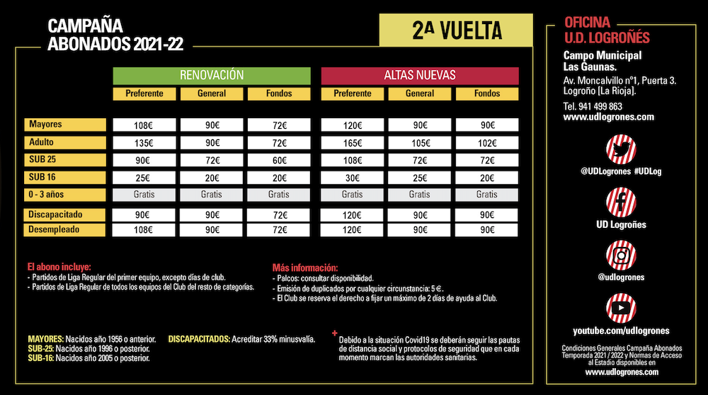 La adquisición de los abonos podrá realizarse desde ahora tanto de forma presencial, en las oficinas del club, en Las Gaunas (de lunes a viernes, de 10 a 13.30 horas y de 16 a 20 horas), como a través de la web oficial (http://www.udlogrones.com) en la sección de ‘Área Social’.