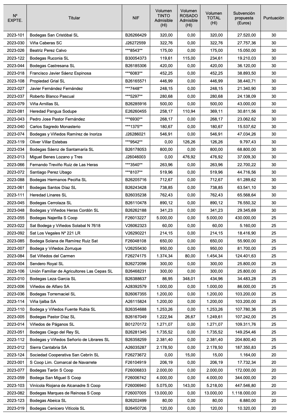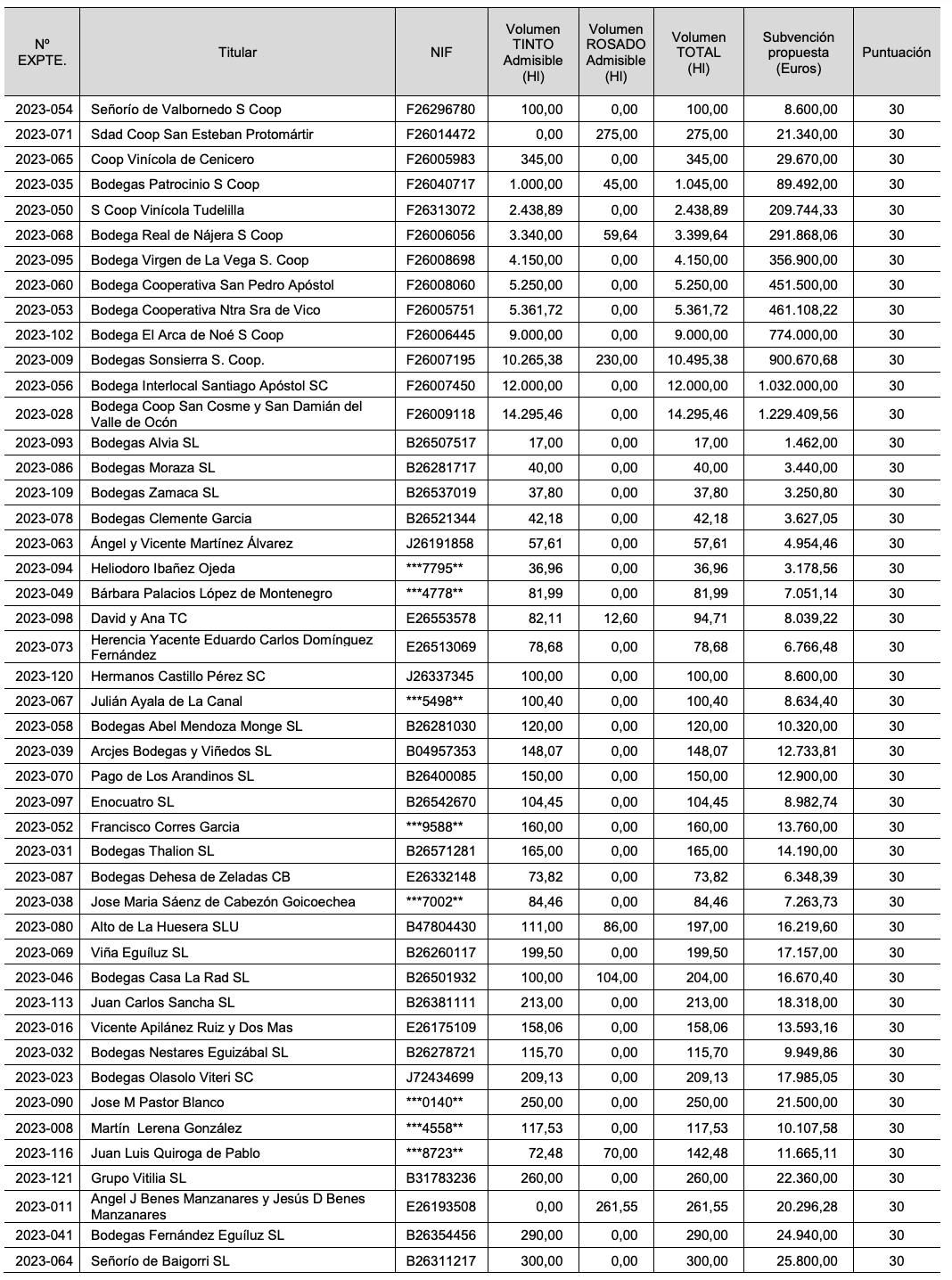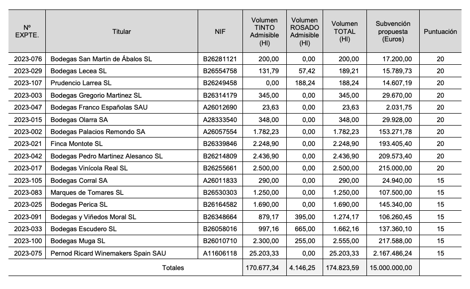 Pernod Ricard Winemakers Spain -Campo Viejo, AGE e Ysios-, es la bodega que recibirá la mayor ayuda, 2,17 millones de euros por 25.203 hectólitros de vino tinto. Las siguientes entidades en recibir las mayores cuantías son la cooperativa San Cosme y San Damián de El Redal, con 1,23 millones de euros y la cooperativa Marqués de Reinosa de Autol, con 1,12 millones.