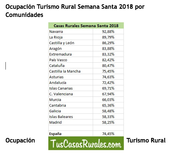 La ocupación de las casas rurales durante la Semana Santa de 2018 alcanza un 74,2%, entre todos los alojamientos rurales que tienen su calendario de ocupación actualizado entre el 28 de marzo y el 1 de Abril de 2018, a falta de contabilizar las reservas de última hora, según los datos que recogidos en www.tuscasasrurales.com. La Rioja es la segunda comunidad con con una mayor ocupación.