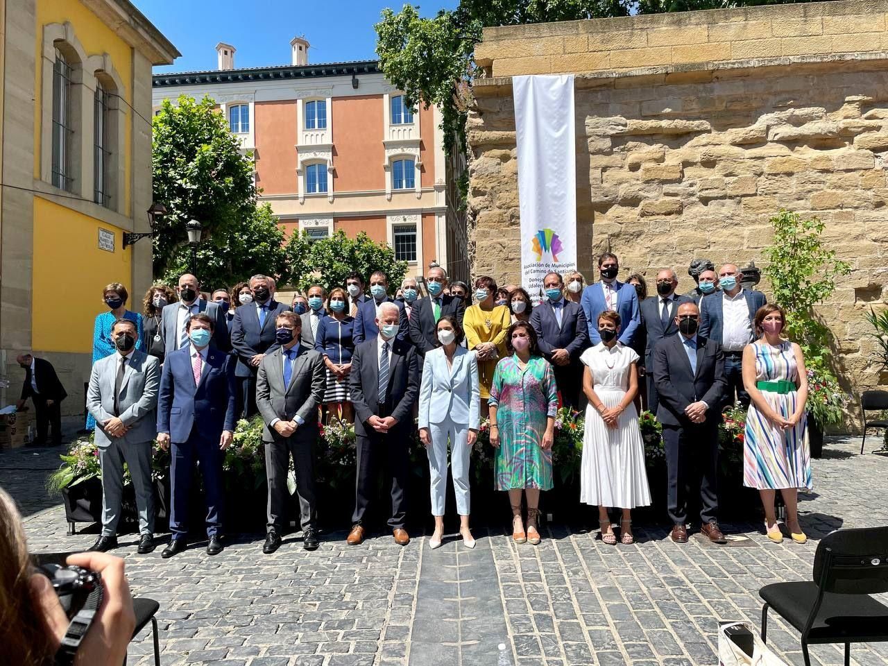 Arropados por la ministra de Industria, Comercio y Turismo, Reyes Maroto, el presidente de la AMCS y alcalde de Logroño, Pablo Hermoso de Mendoza, la presidenta de La Rioja, Concha Andreu; el presidente de Galicia, Alberto Núñez Feijóo; la presidenta de Navarra, María Chivite; el presidente de Castilla y León, Alfonso Fernández Mañueco, y el consejero de Educación, Cultura y Deporte del Gobierno de Aragón, Felipe Faci, han firmado la Declaración de Cooperación Institucional del Camino de Santiago Francés.