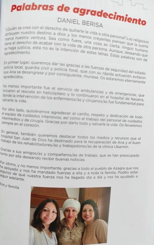 Por último, Ana tiene unas palabras para sus amigos y amigas y compañeros y compañeras de trabajo y para todo el pueblo de Azagra. “Podéis estar seguros de que vuestra fuerza nos ha llegado día a día y nos ha ayudado a seguir adelante”.