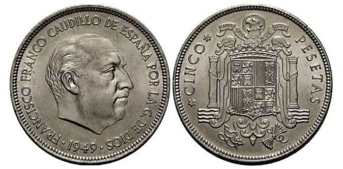 5 pesetas 1949. Esta moneda es la joya de la corona. Se ha llegado a vender por 20.000 euros, aunque lo más común es pagar en torno a 12.000.