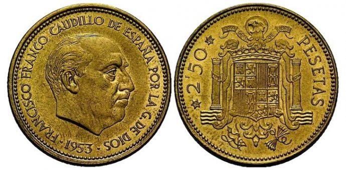 2,5 Pesetas 1953. Esta es una de las monedas más difíciles de encontrar y se pagan hasta 1.700 euros por ellas.