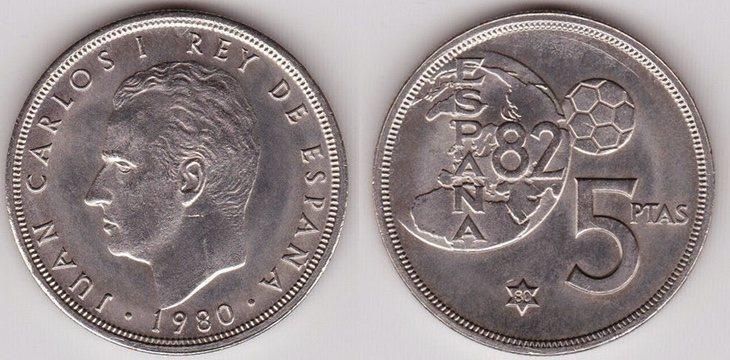 5 Pesetas Mundial 1982. Las monedas acuñadas para el Mundial del 82 son de las más cotizadas. Se puede llegar a pagar por ellas entre 350 y 400 euros.