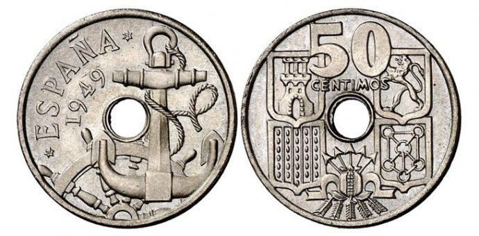 50 Céntimos 1949 e-51. La moneda de 50 céntimos con un agujero en interior fabricada en 1951 se vende por 500 euros.