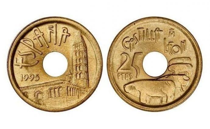 25 Pesetas de 1995. Los cinco duros con el agujero pueden valer hasta 100 euros.