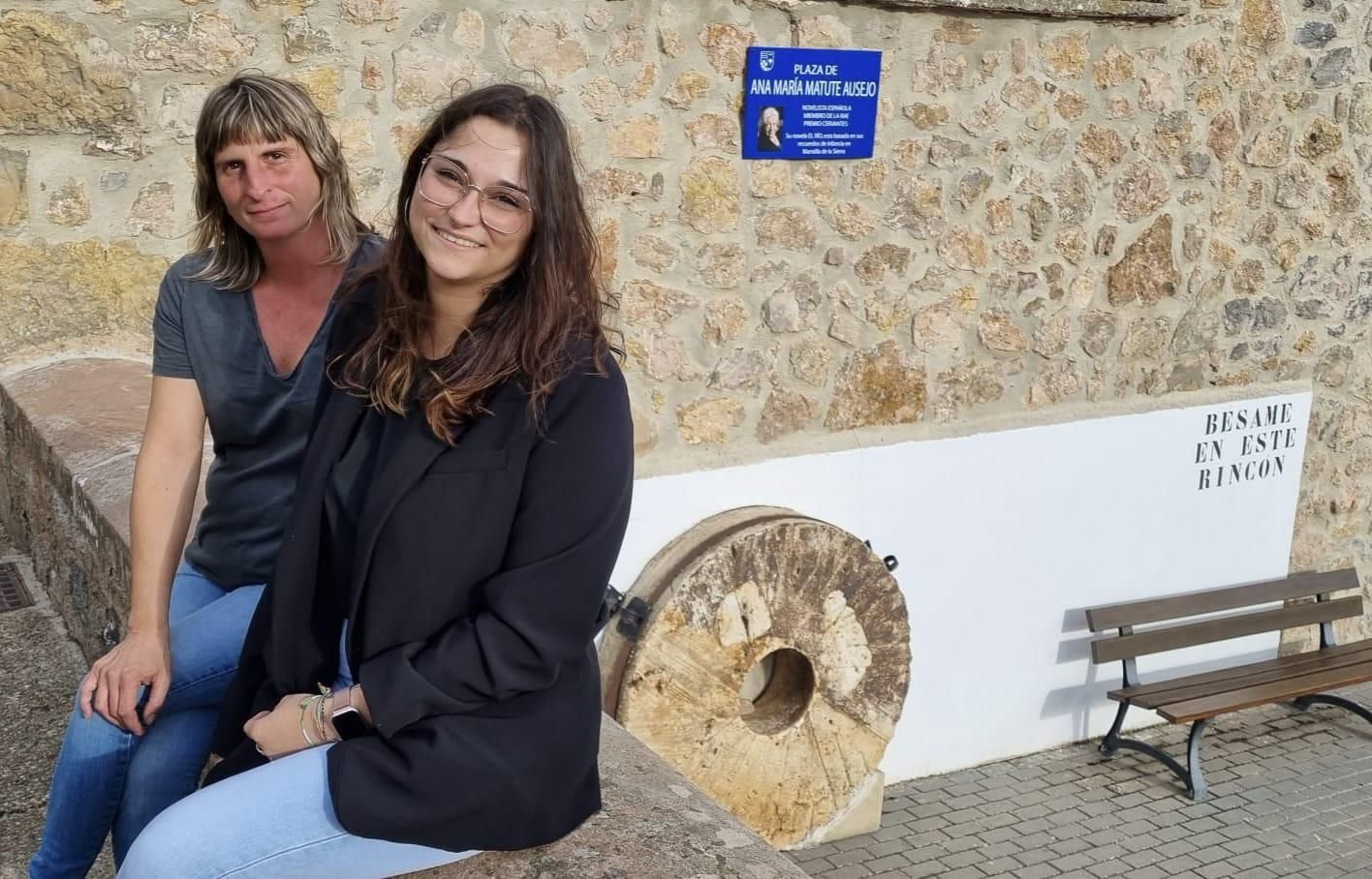 *Rocío e Itziar posan en la plaza de Ana María Matute en Mansilla