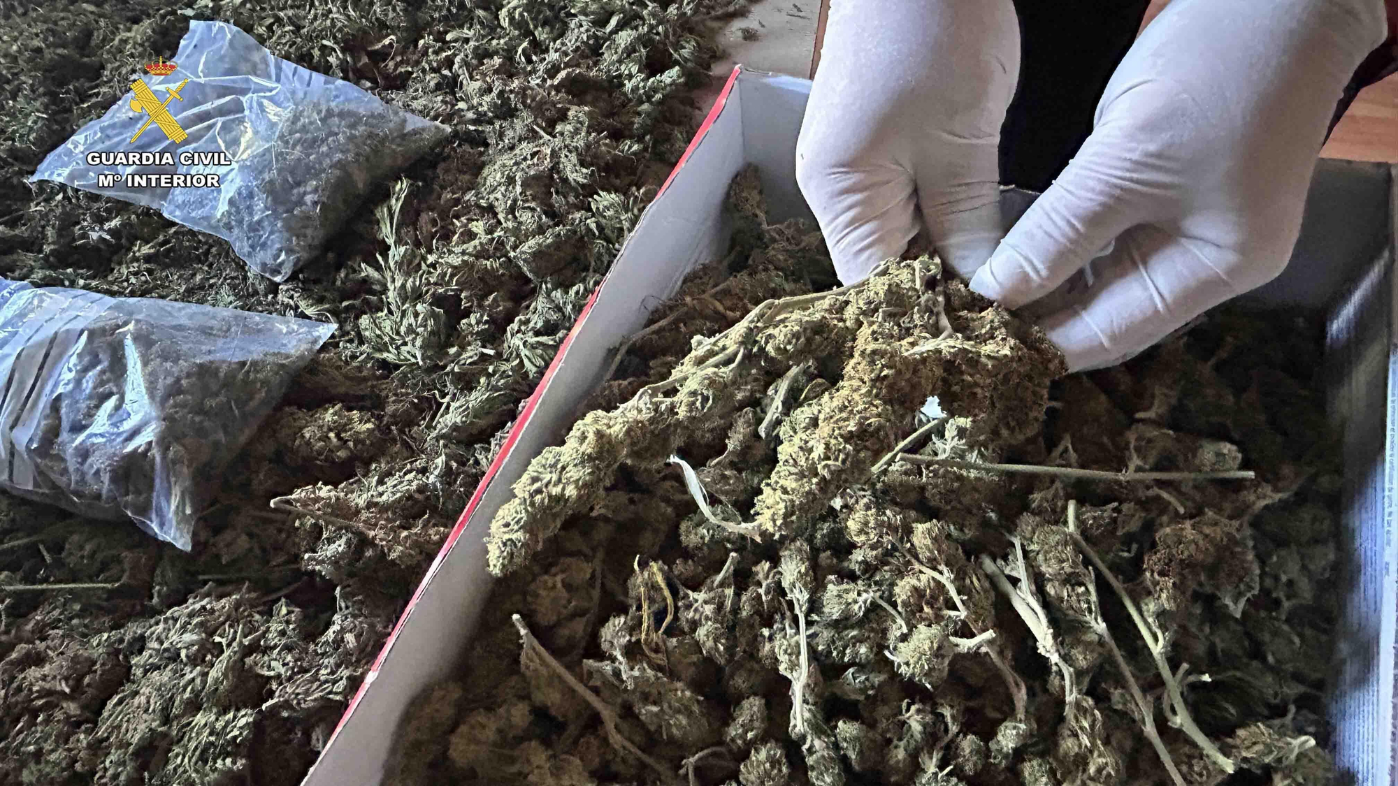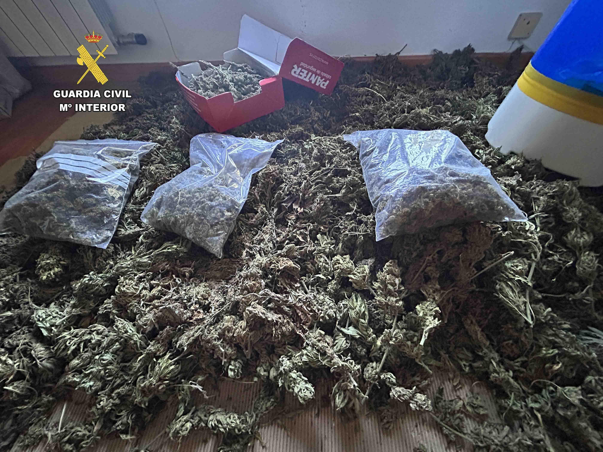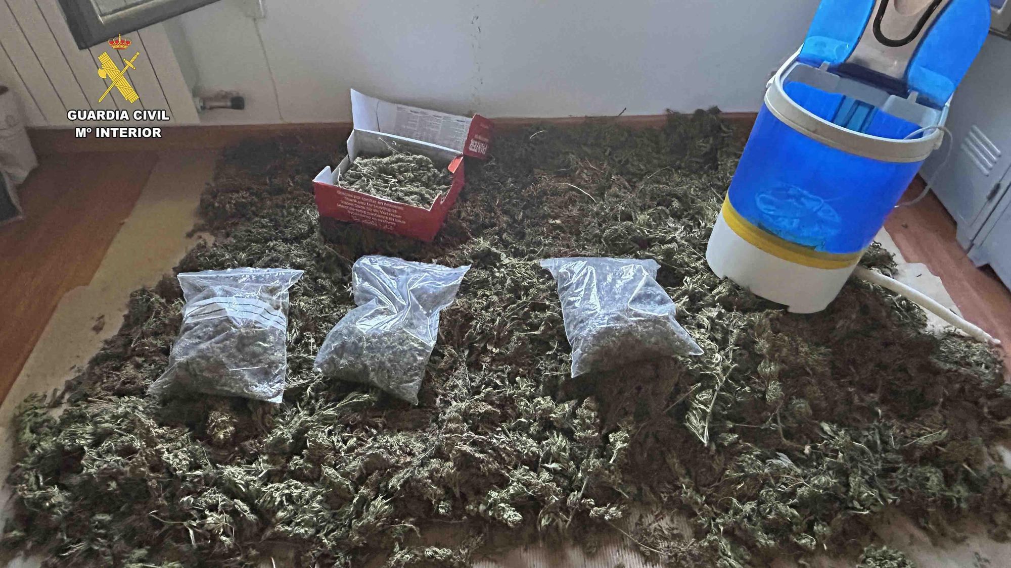 Durante la inspección de la finca los agentes intervinieron en una caja de zapatos, en varias bolsas y en un bidón, otros cuatro kilos de cogollos de marihuana preparados y listos para su distribución, junto a una lavadora en frío de marihuana, para extracción del polen del cannabis y elaboración de hachís.