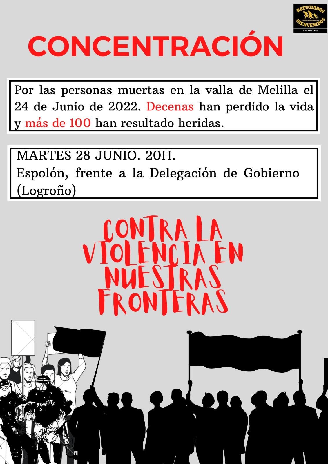 La Plataforma Bienvenidos Refugiados de La Rioja ha convocado una concentración en repulsa de la violencia vivida este viernes 24 de junio en la valla de Melilla. Al menos 37 personas han muerto y más de 100 han resultado heridas.
