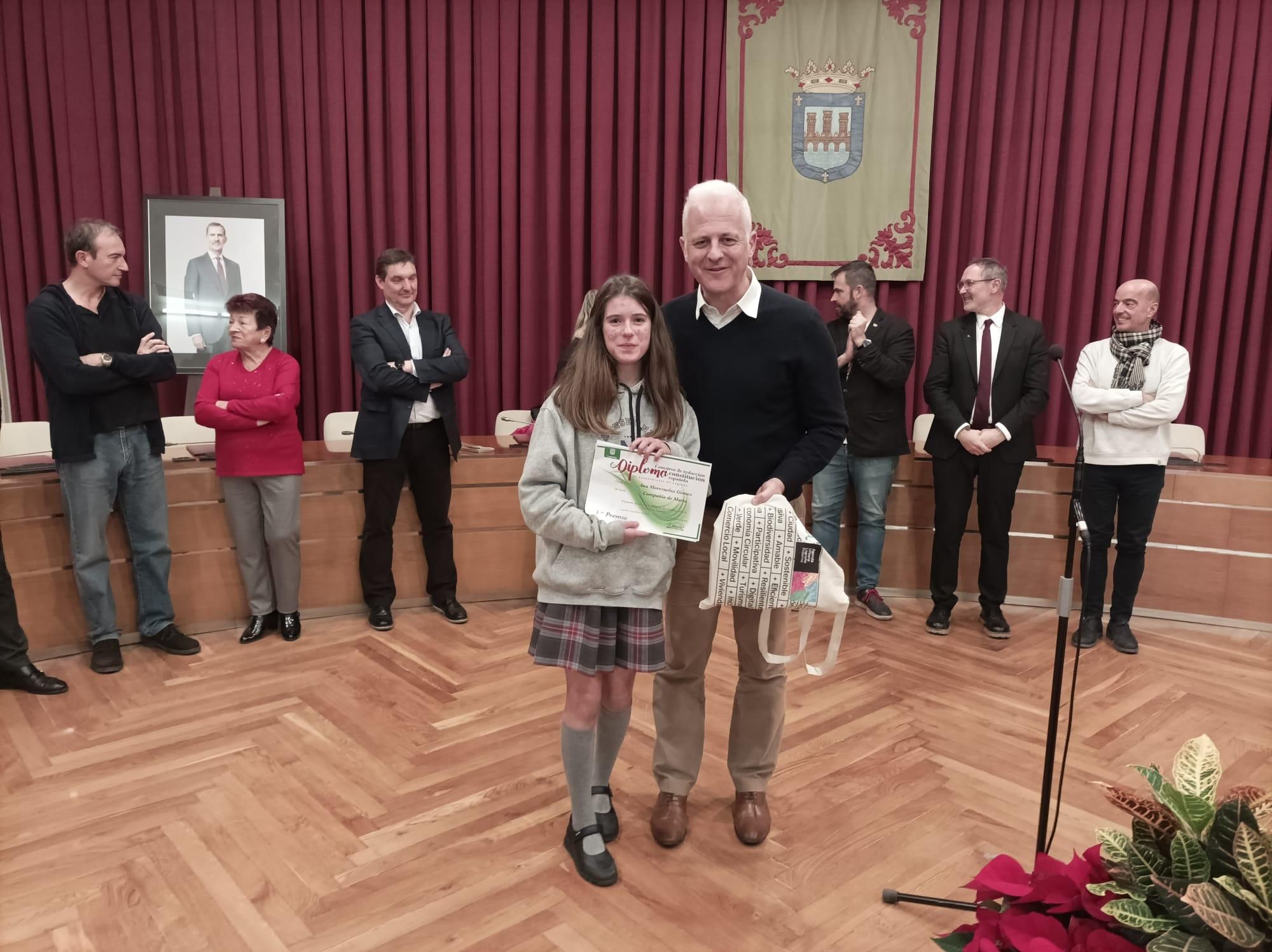 El alcalde de Logroño, Pablo Hermoso de Mendoza, ha entregado este jueves, en el Auditorio del Ayuntamiento, los premios del 44.º Concurso de redacción sobre la Constitución. Ana Morezuelas Gómez, del colegio Compañía de María, ha sido la ganadora.