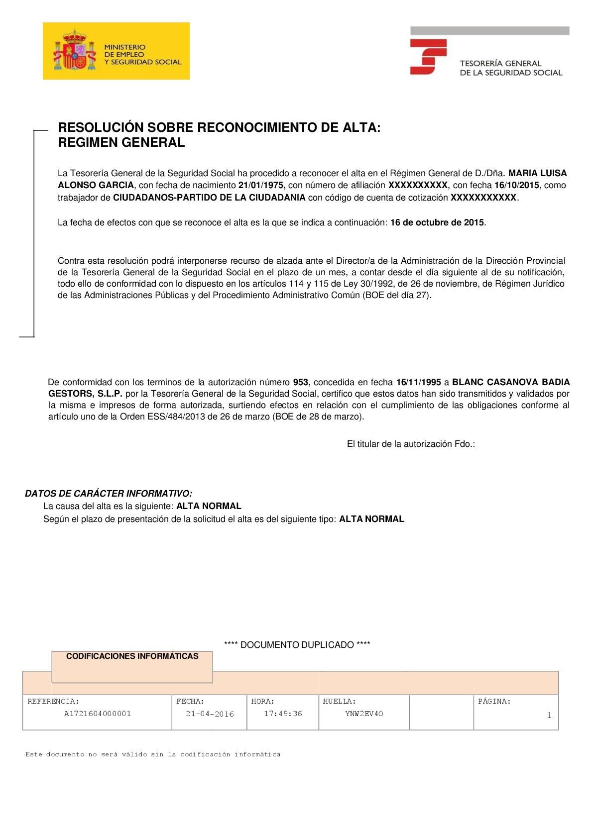 Esta es la explicación que hemos recibido por parte del Partido, el “error administrativo” se detecta en febrero de 2016 pero, sin embargo, en octubre de 2015, la concejala ya aparece dada de alta en la Seguridad Social a cargo del Partido Ciudadanos. Tal y como aparece reflejado en el documento facilitado por Ciudadanos en el que también queda reflejado que es la gestoría Blanc Casanova Badía la encargada de realizar todas estas cuestiones, gestoría cuya sede está en Barcelona.