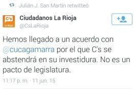 Las reacciones a través de esta misma red social no se han hecho esperar. Los tuits recordando la postura en defensa del cambio que tanto Julián San Martín como Ciudadanos han adoptado a lo largo de toda la campaña, se sucedían a modo de reproche.