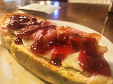 Bruschetta de queso de cabra, jamón, y mermelada de frambuesa es todo lo que necesita saber. Una rebanada de pan tostado con queso de cabra, jamón y mermelada de frambuesa; una combinación que proporciona extraña perfección. Si usted debe escoger un solo pincho de mi lista, por favor, deje que sea esta. ¡Un pequeño mordisco te enganchará! A menos que no te guste el queso de cabra y mermelada de frambuesa fresca; olvide lo que acabo de decir.