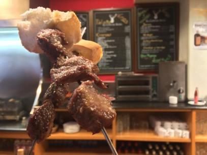 ¿Hambriento de un poco de carne? Aquí, en la barra Páganos se encuentran algunos de los mejores y más jugoso pinchos de carne de la calle.