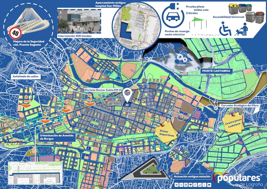Entre las inversiones incluidas por los populares en sus enmiendas se encuentra: intervención en el Paseo de las Cien Tiendas (125.000 euros, I Fase), Glorieta del Doctor Zubía coordinado con las obras del IES Sagasta (200.000 euros), adecuación de la antigua estación de autobuses para centro de participación activa y ajardinamiento zona exterior (300.000 euros, Fase I), intervenciones de eficiencia energética en el alumbrado público (500.000 euros, Fase I), reurbanización en Avenida de Burgos en los tramos en los que hay disponibilidad de los terrenos (150.000 euros, entorno del parque de la Solana), acondicionamiento de aparcamiento provisional en el solar anexo a la Escuela de Enfermería (250.000 euros), puesta en marcha de un proyecto de microparques para recuperar plazas urbanas (225.000 euros). Se contempla también la reforma del Mercado de San Blas y medidas relacionadas con el fomento de la utilización del autobús urbano.