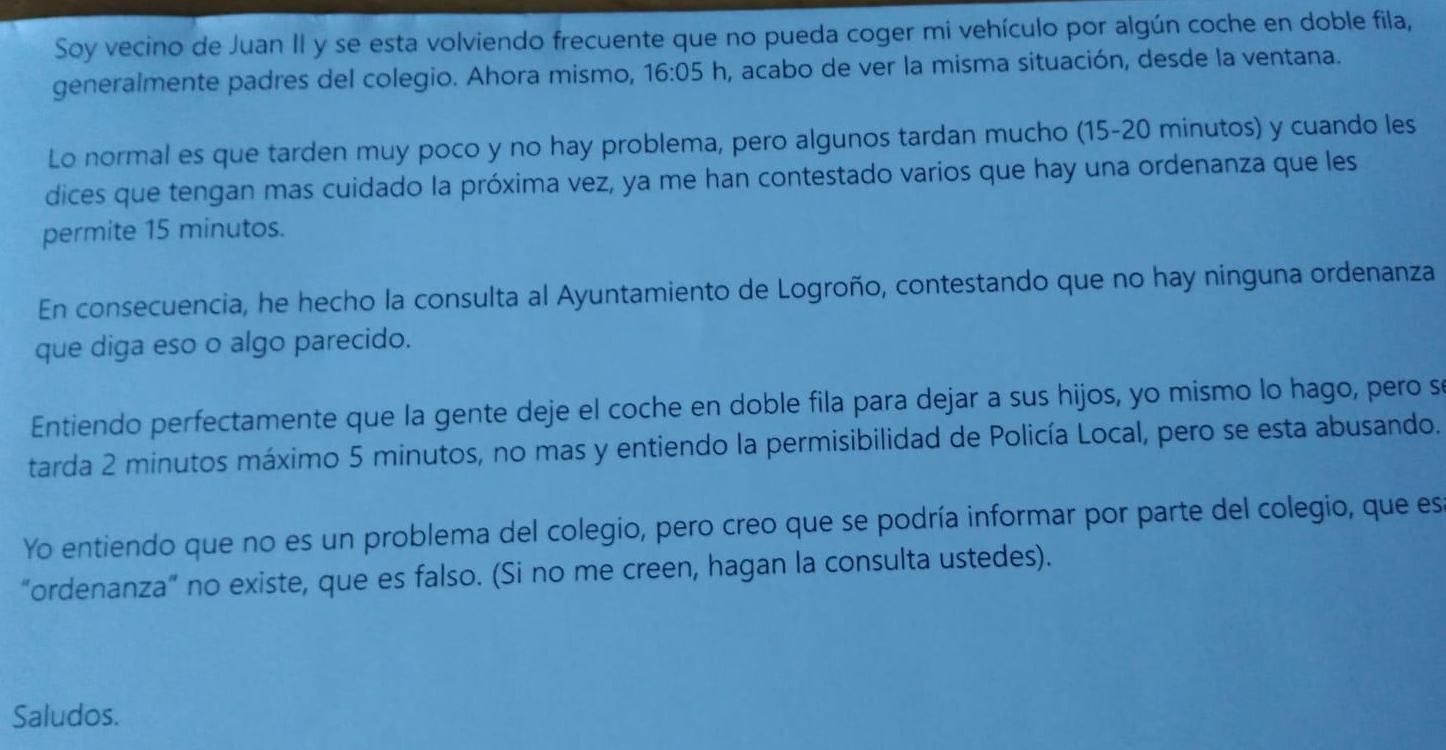 “Entiento perfectamente que la gente deje el coche en doble fila para dejar a sus hijos, yo mismo lo hago, pero se tarda dos minutos, máximo cinco, no más, y entiendo la permisividad de la Policía Local, pero se está abusando”, dice la carta del vecino, “esa ordenanza no existe, es falso, si no me creen, hagan la consulta ustedes”.