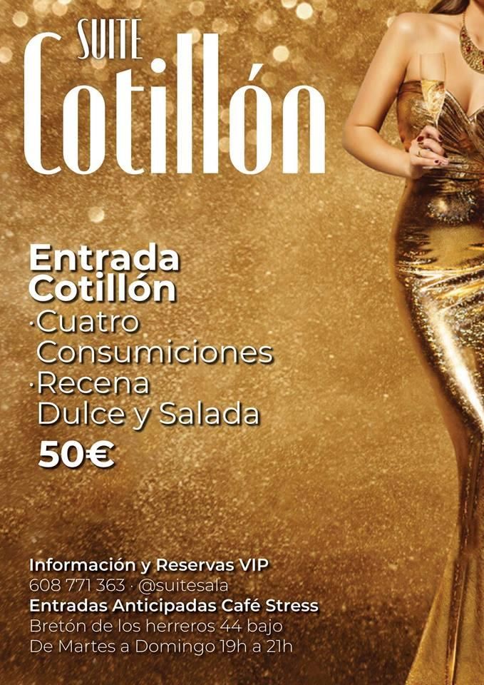 Del mismo grupo, también la Sala Suite ha preparado un cotillón por todo lo alto para recibir el año. Desde las 1,30 horas y con horario especial hasta las 8 de la mañana, la discoteca de la calle Siervas de Jesús de Logroño ofrece un cotillón con una entrada de 50 euros que incluye cuatro consumiciones y recena y otra de 90 euros para los que quieran acceder a la zona VIP con una botella por persona.