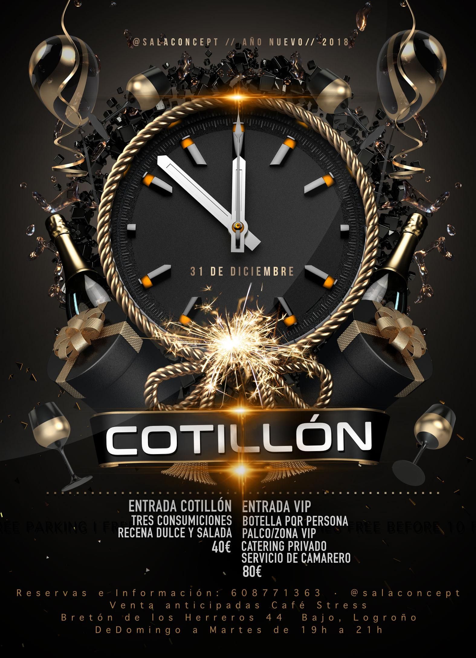 Un clásico de estas fechas son los cotillones en discotecas. En Logroño, la sala Concept (Duquesa de la Victoria, 8) es una de las que ofrece una fiesta por todo lo alto para comenzar el año, desde la 1:30 horas, con tres consumiciones o recena por 40 euros o entrada VIP (con espacio palco, botella por persona, camarero y recena) por 80 euros.