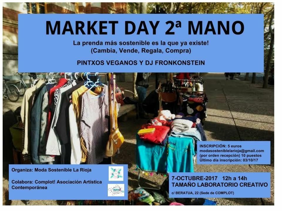 2. Market Day Segunda Mano. Porque la prenda más sostenible es la que ya existe. El local de la Asociación Artística Complot! acogerá este sábado 7 de octubre, entre las 12 y las 14 horas, un mercado de segunda mano organizado por el colectivo 'Moda Sostenible La Rioja'.