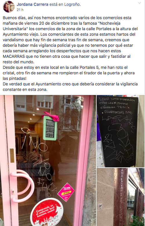 Entre ellos, Jordana Carrera, quien ha denunciado en las redes sociales las pintadas que se ha encontrado en la puerta de su comercio. Explica que no es la primera vez que esto sucede. De hecho, asegura que desde que se trasladó a la calle Portales, también le han roto el cristal y el tirador de la puerta.