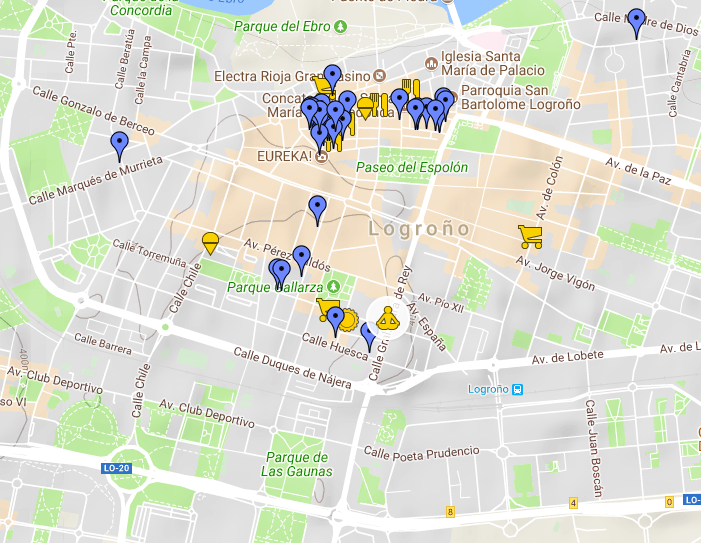 El mapa, actualizado a febrero de 2018, incluye casi 40 bares de Logroño, la mayoría en el entorno del Casco Antiguo. También hay varios restaurantes con menús vegetarianos o veganos y heladerías, panaderías, pastelerías y tiendas veggies.