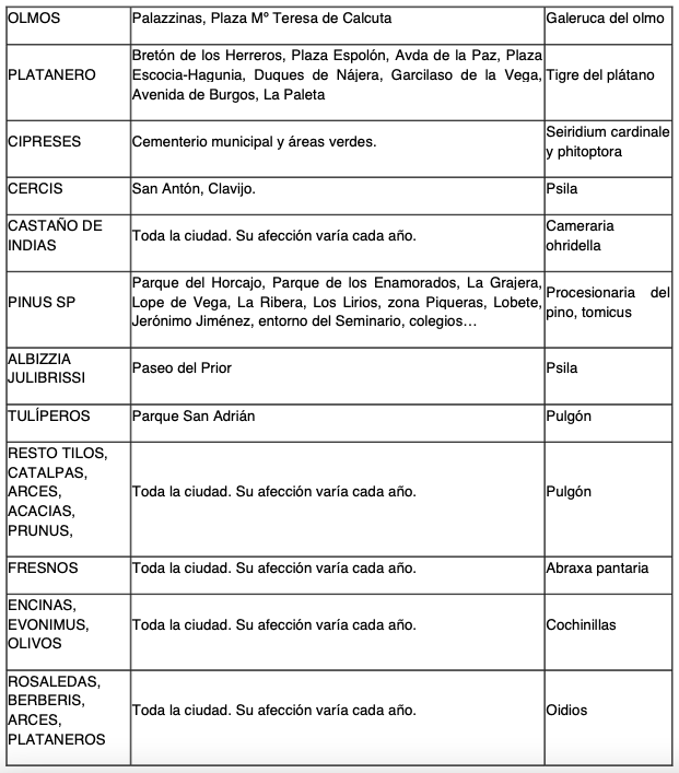 El monitoreo que se realiza desde la Unidad de Medio Ambiente de las especies propensas a convertirse en plaga es muy diverso y van desde los conocidos estorninos hasta los caracoles, las hierbas adventicias, la procesionaria del pino, la cameraria en castaños, la galeruca en olmos, la psila, el tigre del plátano, el pulgón, las cochinillas, el oídio, etc.