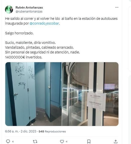 El concejal del Partido Riojano, Rubén Antoñanzas, ha expresado a través de sus redes sociales su malestar con la situación de los baños de la nueva estación de autobuses. Como ha mostrado por redes sociales, estos contaban con pintadas en varias puertas, así como suciedad en el suelo. “Sucio, maloliente, diría vomitivo. Vandalizado, pintadas, cableado arrancado. Sin personal de seguridad ni de atención, nadie. 14000000€ invertidos”, expresaba, añadiendo, igualmente, una fotografía en la que se podía ver la puerta de entrada a la estación fuera de servicio.