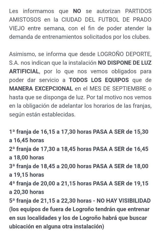 Los nuevos focos se podrán comenzar a instalar a partir del 15 de septiembre. Hasta que se complete toda la instalación se ha decidido adelantar algunos entrenamientos con el fin de aprovechar la luz del día en un momento en el que cada vez la oscuridad llega más pronto. “Los equipos están informados y entienden la situación y la llevan con la mayor paciencia”, ha concluido. En general, todos los entrenamientos se adelantan tres cuartos de hora, se suspenden los partidos amistosos y se pide a los equipos de fuera de Logroño que entrenen de momento en sus localidades.