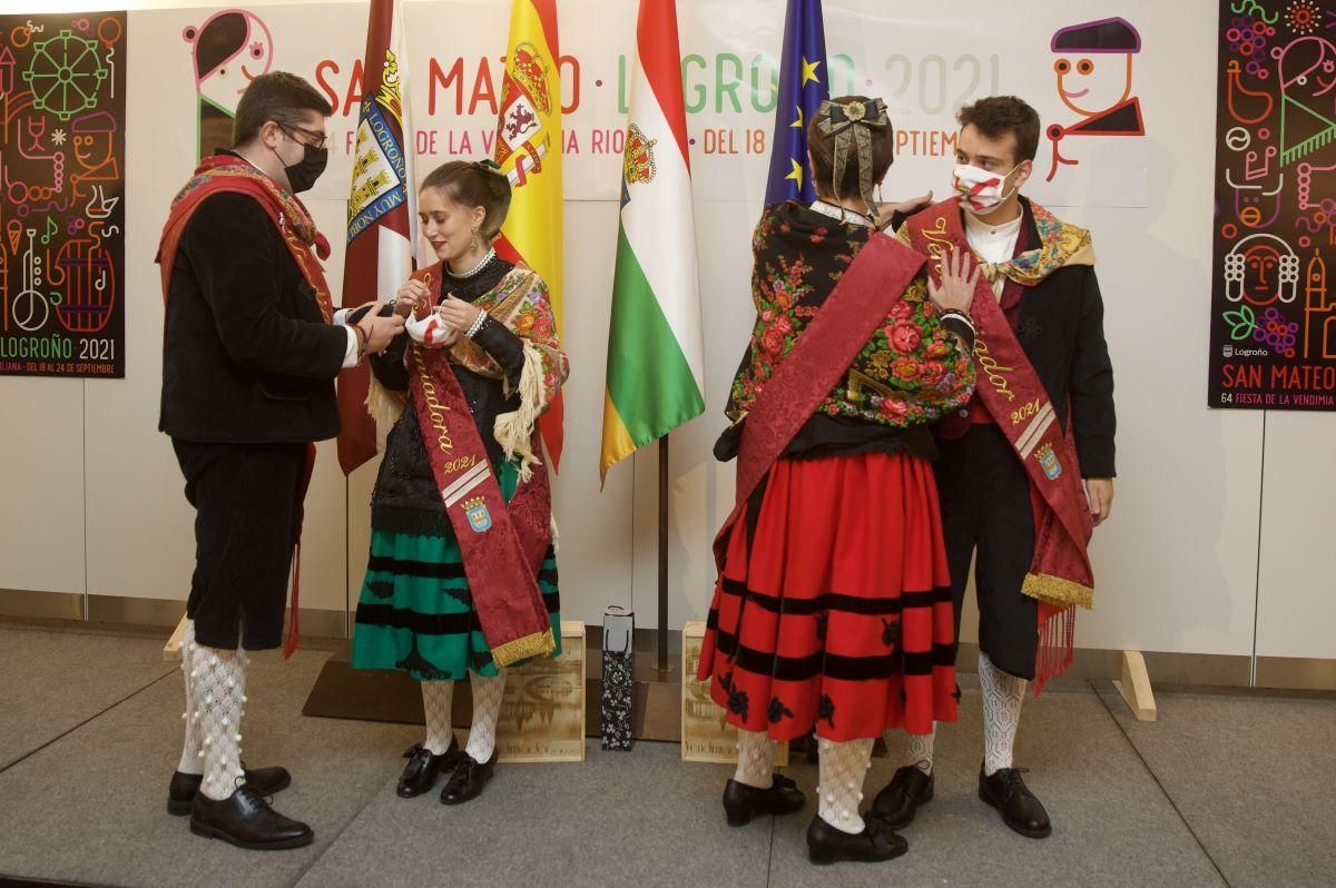 En este tradicional evento previo a las fiestas el alcalde de Logroño también ha impuesto las bandas a la pareja vendimiadora de San Mateo 2021, formada por Andrea Morán Couceiro y Abel Alonso Santolaya.
