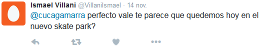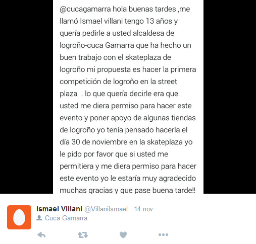 Ismael Villani es uno de ellos. Es skater y tiene tan sólo 13 años, además de las cosas muy claras. Tanto, que no dudó en crear una cuenta de Twitter exclusivamente para contactar con la alcaldesa Cuca Gamarra y mostrarle su intención de organizar un evento deportivo.