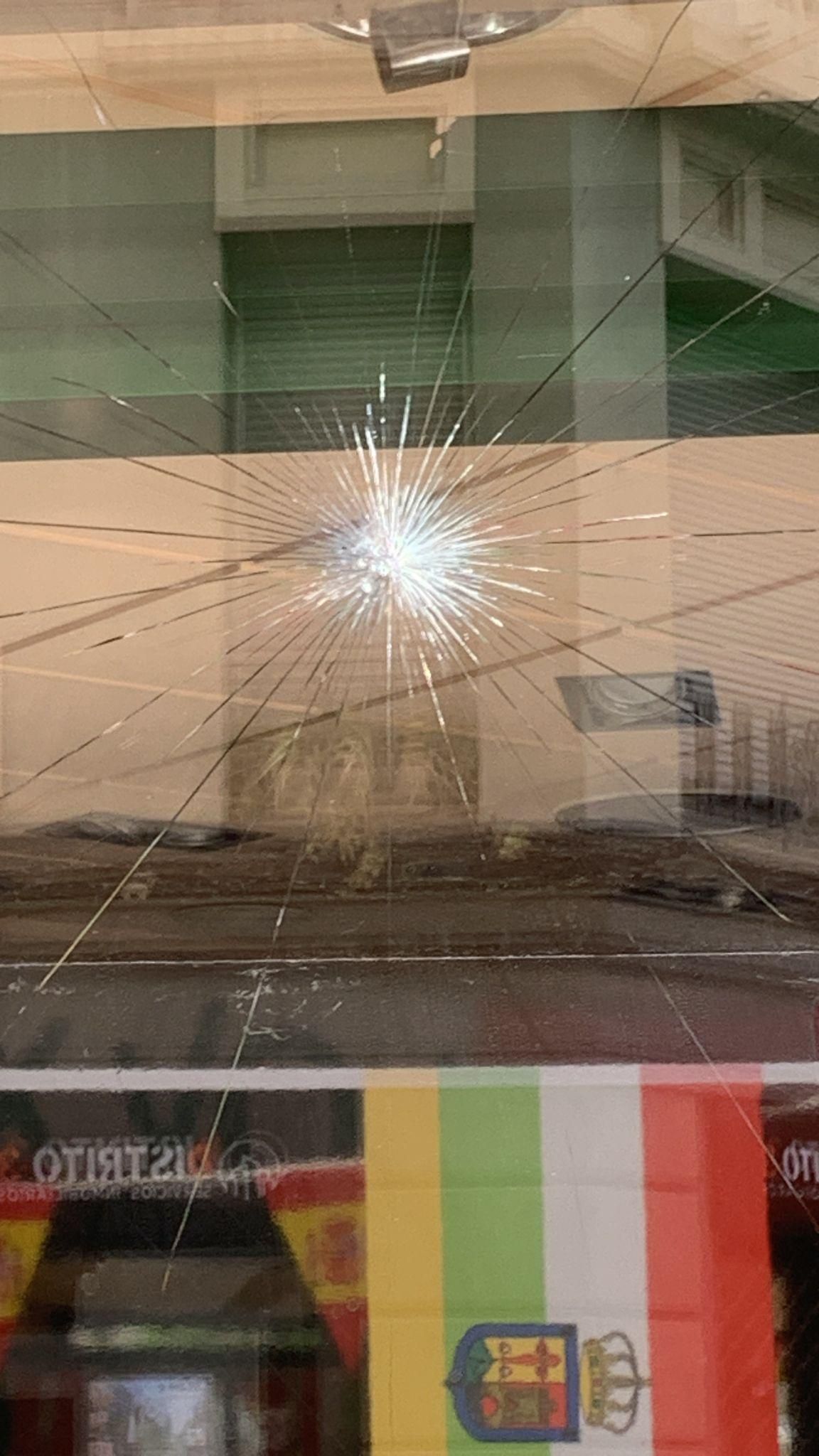 En concreto, este lunes su local, ubicado en la Calle Calvo Sotelo, ha amanecido con un cristal roto por el lanzamiento de una piedra contra este, como puede apreciarse en las imágenes que han compartido.