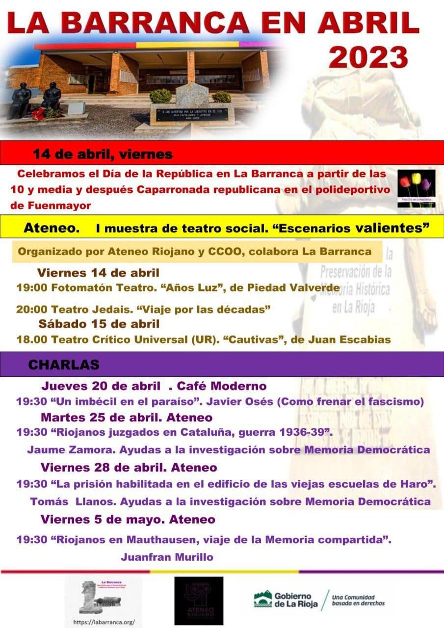 Además, se han organizado varias charlas. El jueves 20 de abril en el Café Moderno “Un imbécil en el paraíso”, el martes 25 de abril en el Ateneo Jaume Zamora hablará de los Riojanos juzgados en Cataluña en la Guerra Civil.