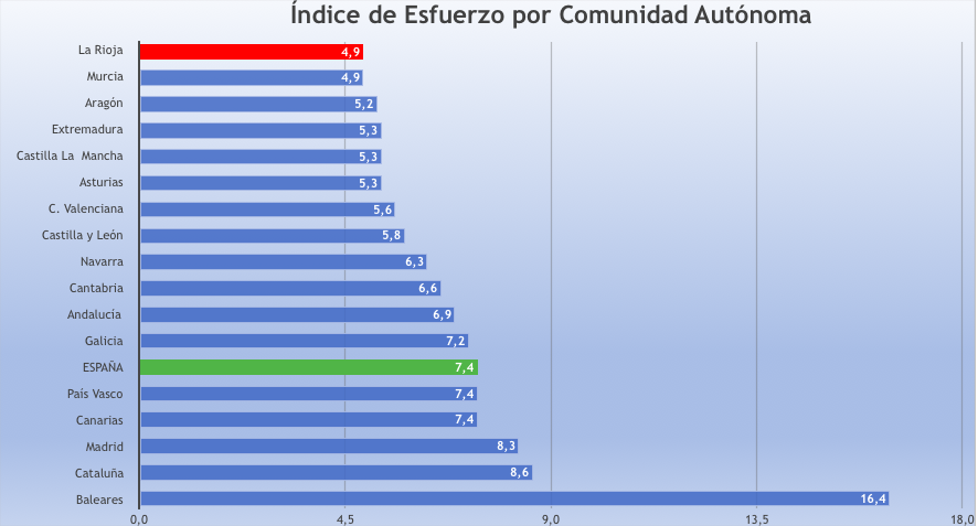 Tras La Rioja y Murcia se sitúa Aragón (5,2), Extremadura, Castilla La Mancha y Asturias (5,3), Valencia (5,6), Castilla y León (5,8). A partir de este baremo, el resto de las regiones ya superan el índice 6. Navarra (6,3), Cantabria (6,6), Andalucía (6,9). Superan el índice 7 Galicia (7,2), País Vasco (7,4) y Canarias (7,4). El mayor esfuerzo lo realizan los compradores de Madrid (8,3), Cataluña (8,6) y Baleares (16,4).