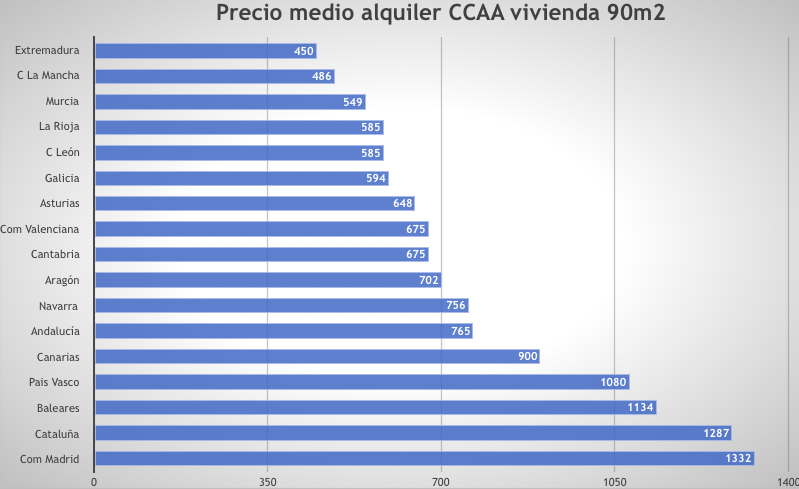 De acuerdo con los últimos datos publicados en portales digitales sobre los precios medios de alquiler correspondientes al 4º trimestre de 2019, La Rioja, con 585 euros de media es la cuarta comunidad autónoma con los precios de alquiler más bajos, solo superada por Extremadura (450 euros), Castilla La Mancha (486 euros) y Murcia (549 euros). Entre las más caras se encuentran Madrid (1.332), Cataluña (1.287), Baleares (1.134) y País Vasco (1.080) o Navarra (756).