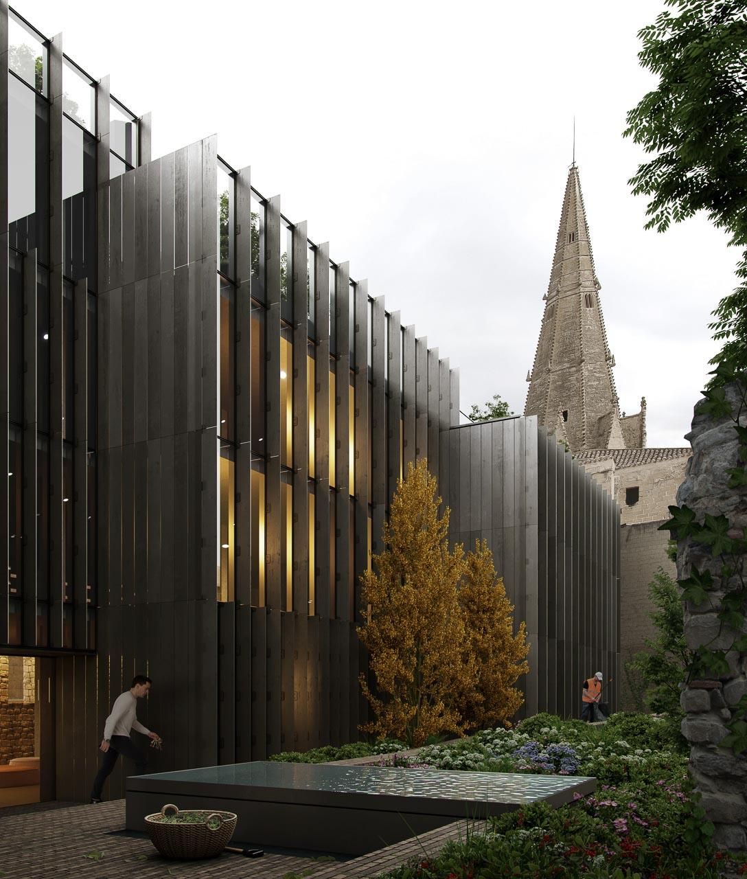 El objetivo de la obra es recuperar la tradición de los edificios y reinterpretarla con un punto de vista contemporáneo y unas características únicas que no serían posibles en otra ubicación. “Además de mantener y poner en valor los muros existentes en planta baja, las fachadas nuevas hacia la calle se mimetizan con las del casco histórico, usando la tradicional piedra natural de tonos cálidos. Solo hacia el patio interior es donde las fachadas toman un aspecto contemporáneo adecuado para un uso dotacional”, ha explicado el arquitecto logroñés y socio del estudio Kengo Kuma & Associates, Javier Villar. Por tanto, “un diseño que respeta al máximo el entorno en el que se integra con el uso de materiales naturales y tradicionales de la zona y creando una arquitectura de escala humana transmitiendo una sensación de intimidad para mejorar el espacio urbano en el que se asienta”.