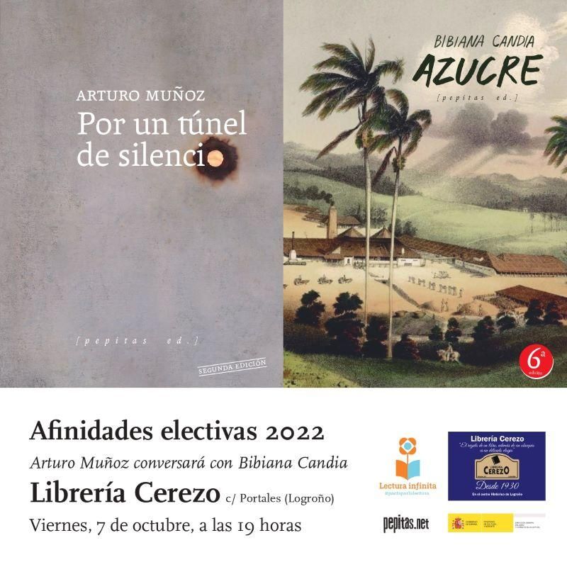 La Librería Cerezo de Logroño acoge el próximo viernes, 7 de octubre a las 19:00, un encuentro entre los escritores Arturo Muñoz y Bibiana Candia dentro del programa Afinidades electivas; dicho programa está auspiciado por la Dirección General del Libro y Fomento de la Lectura, organismo perteneciente al Ministerio de Cultura, esta conversación está organizada por Librería Cerezo en colaboración con la Editorial Pepitas de Calabaza.