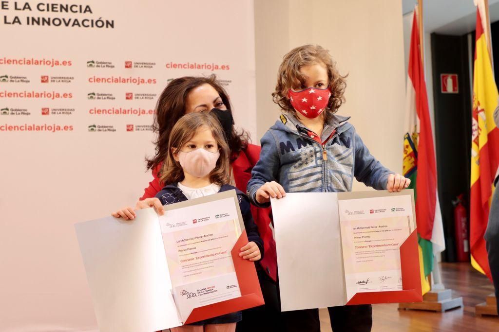 La presidenta del Gobierno de La Rioja, Concha Andreu, ha presidido esta tarde junto con el rector de la Universidad de La Rioja, Juan Carlos Ayala, la entrega de premios a los ganadores del Concurso ‘Experimenta en casa’ de la 1.ª Semana de la Ciencia y la Innovación de La Rioja.