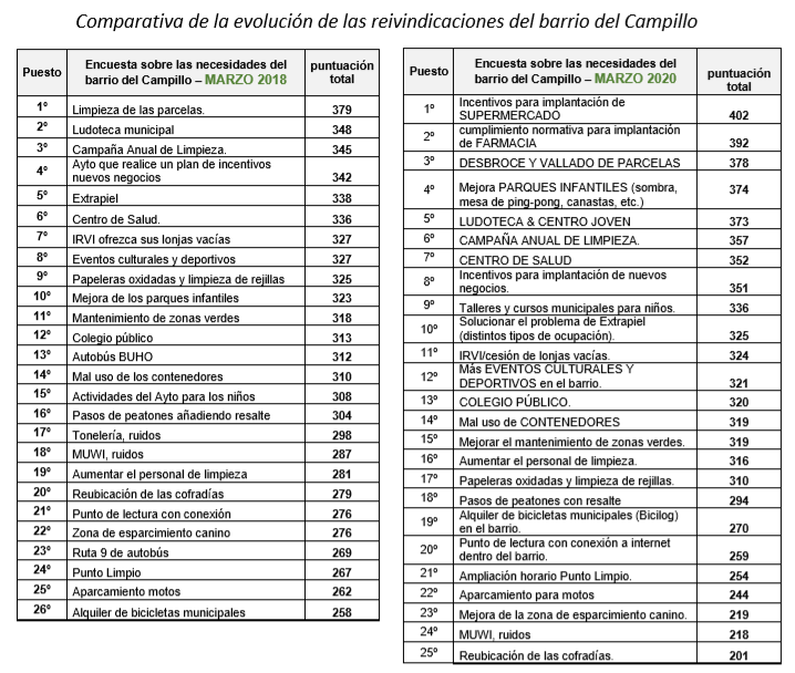 Merecen mención aparte las dos reivindicaciones históricas del barrio junto con la ludoteca, como son el centro de salud y el colegio. Si no están entre los primeros puestos (se sitúan en séptimo y décimotercer lugar, respectivamente) es porque “los vecinos son conscientes de que en la actualidad son demandas que no van a ser atendidas a corto plazo, aunque no por ello renunciamos a las mismas”.