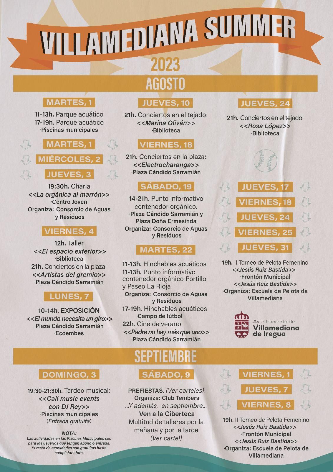 Enfocado a todas las edades, el “Villamediana Summer” pretende dinamizar el verano en la localidad, con un variado programa de actividades que concentra teatro, conciertos y actuaciones musicales, talleres infantiles, hinchables acuáticos, cine, charlas y torneos deportivos de fútbol sala y pelota.