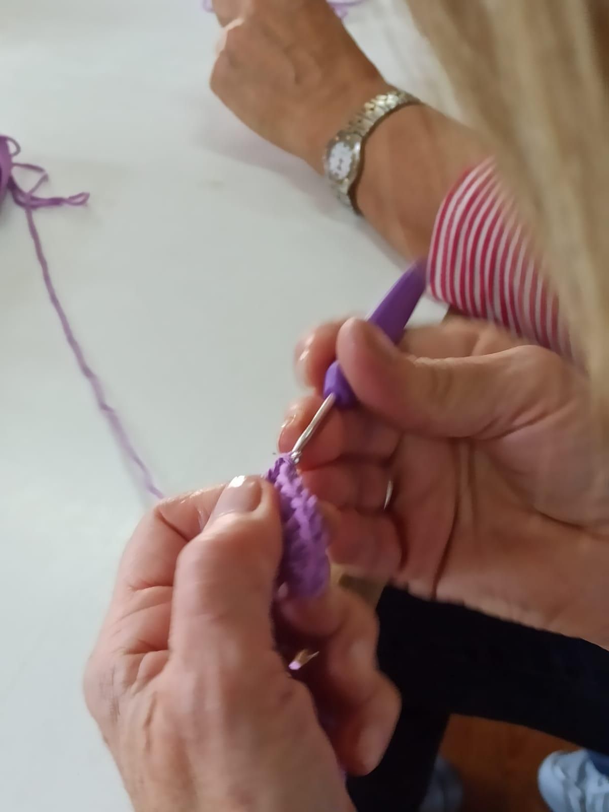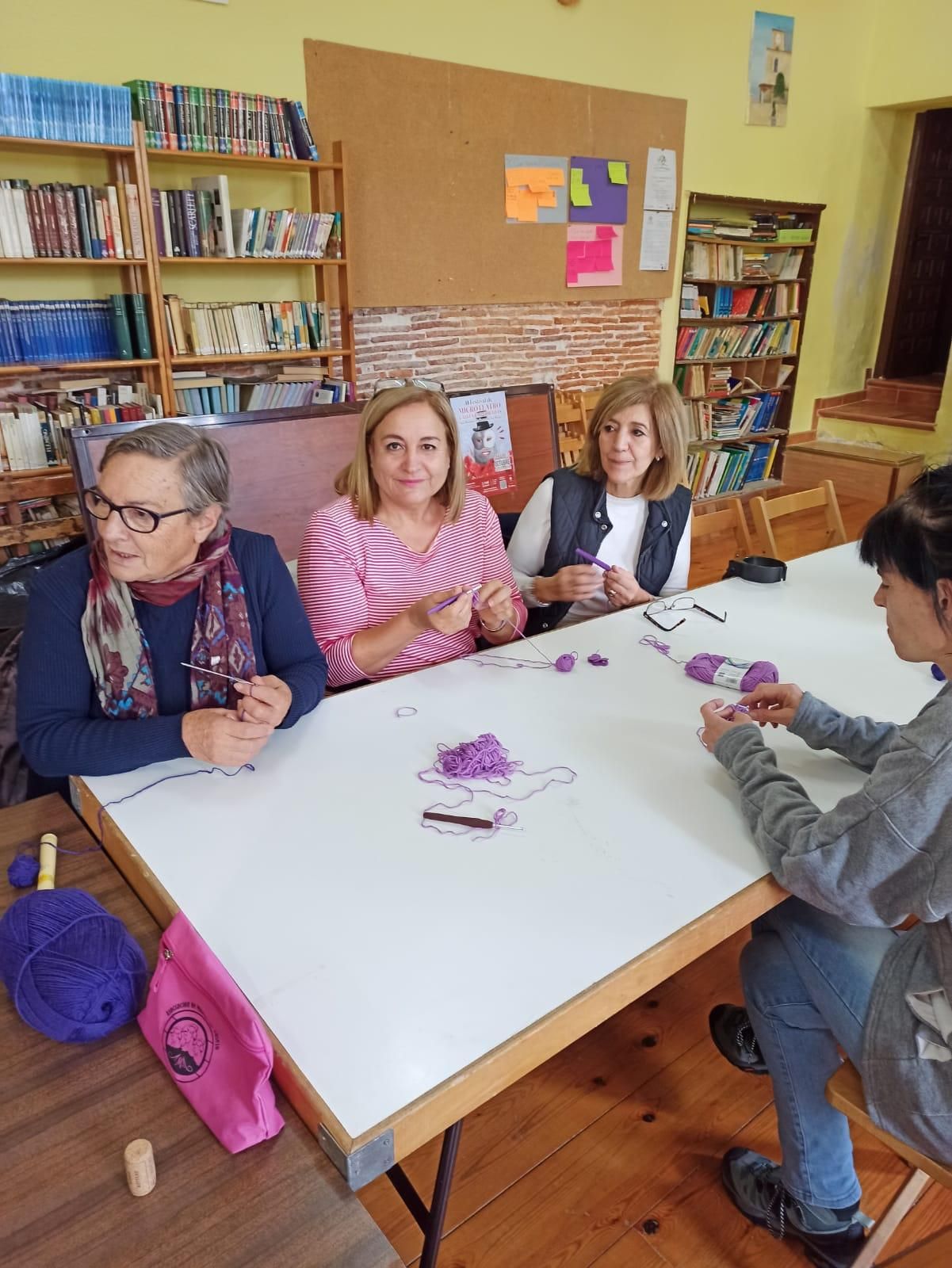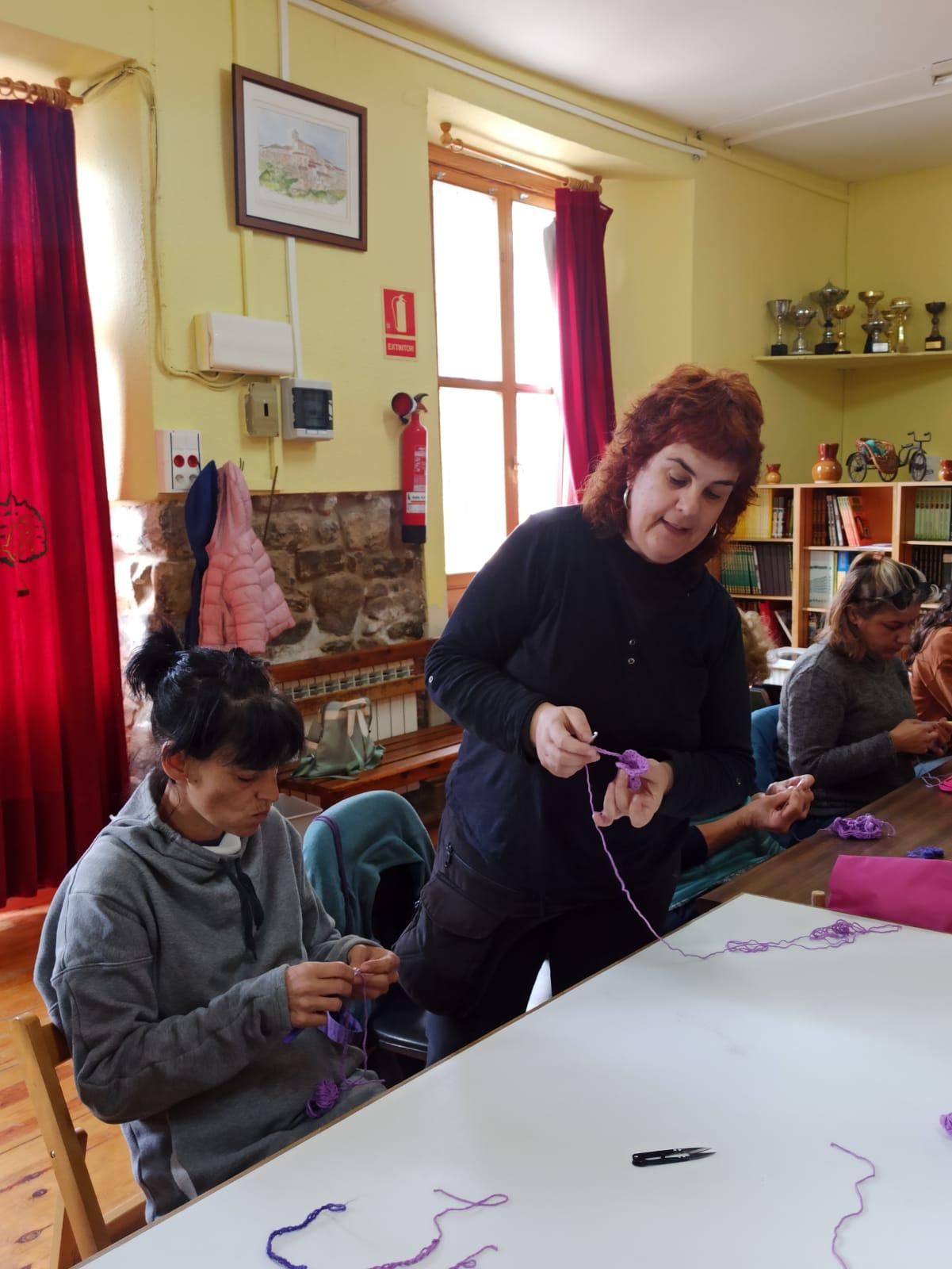 San Román de Cameros acogió este sábado el taller 'Una mañana tejiendo' con el que alrededor de 15 personas se reunieron para tejer mariposas de ganchillo y concienciar sobre la violencia de género y vicaria.