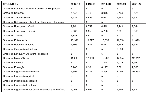Las titulaciones con una mayor nota de corte han sido las de Matemáticas (12,81), Enfermería (11,87), Ingeniería informática (10,45) y Derecho (9,62).