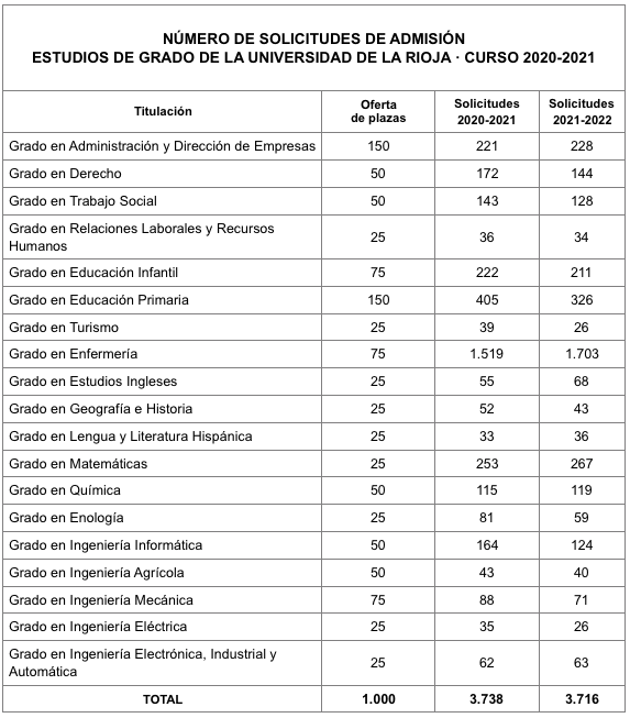 La Universidad de La Rioja ha registrado 3.716 solicitudes de admisión para las 1.000 plazas de nuevo ingreso en estudios de Grado. Esta cifra es similar a la del año pasado, en el que se recibieron 3.738 solicitudes de preinscripción. Se mantiene, por tanto, el incremento experimentado en el curso pasado con respecto a cursos anteriores: 2.504 (2019-20), 2.439 (2018-19), 2.378 (2017-18), 2.095 (2016-17) y 2.167 (2015-16).
