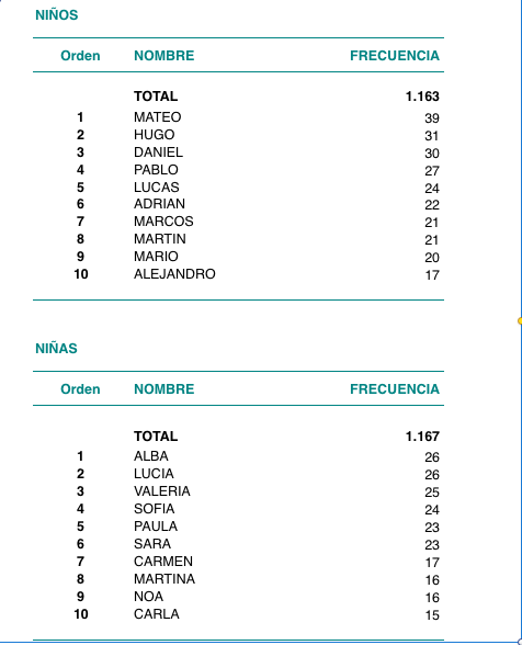 Estadística ha publicado hoy el listado de los nombres y apellidos más frecuentes de los recién nacidos en los últimos quince años, que ha ido cambiando considerablemente en este tiempo.