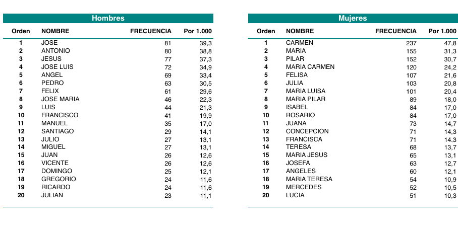 Y si nos remontamos a antes de 1930, los nombres más comunes eran Jose, Antonio, Jesús o José Luis y Carmen, María, Pilar y Mª Carmen.