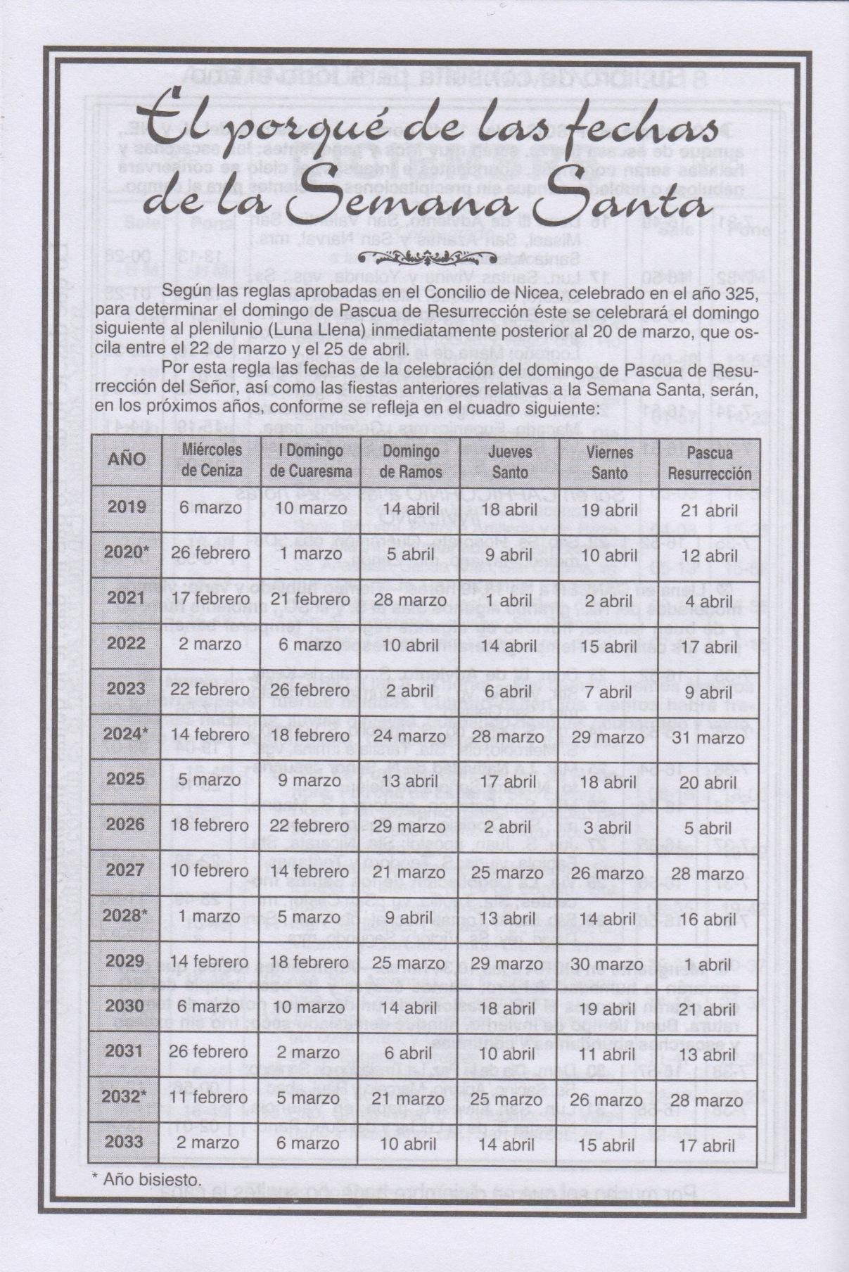 El Calendario Zaragozano explica el porqué de las fechas de la Semana Santa. Y es que según las reglas aprobadas en el Concilio de Nicea, celebrado en el año 325, para determinar el domingo de Pascua de Resurrección éste se celebra el domingo siguiente al plenilunio (luna llena) inmediatamente posterior al 20 de marzo, que oscila entre el 22 de marzo y el 25 de abril.